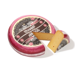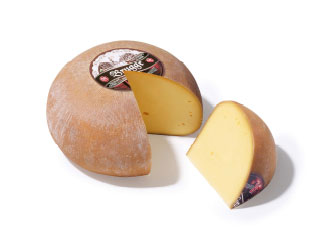 A round, old cheese with a Bordeaux red natural crust.